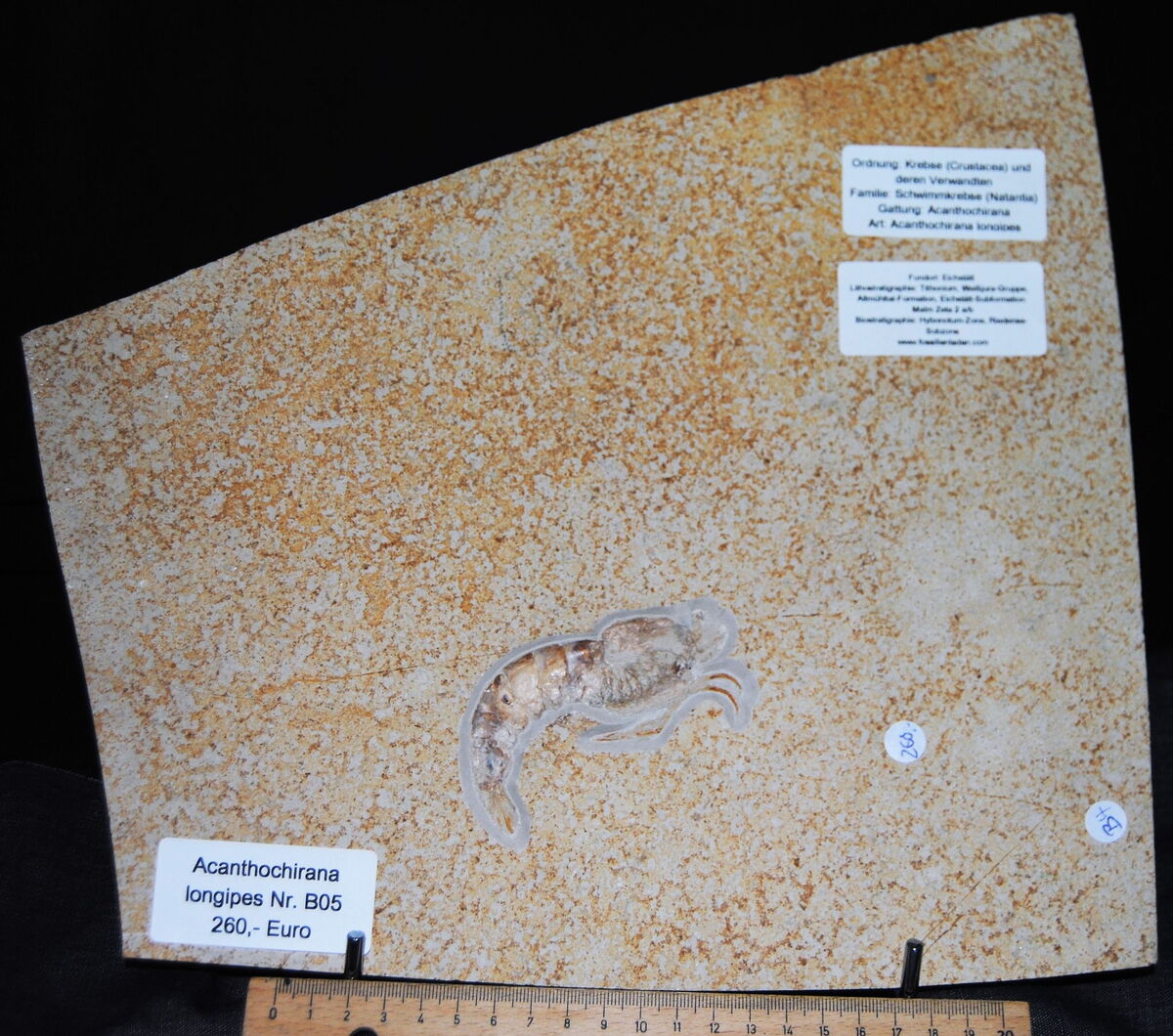 Lithostratigraphie: Tithonium, Weißjura-Gruppe, Altmühltal-Formation, Eichstätt-Subformatio. Malm Zeta 2 a/b Hybonotum-Zone, Riedense-Subzone Gewicht ca. 1570g, Plattenstärke ca. 0,9 cm