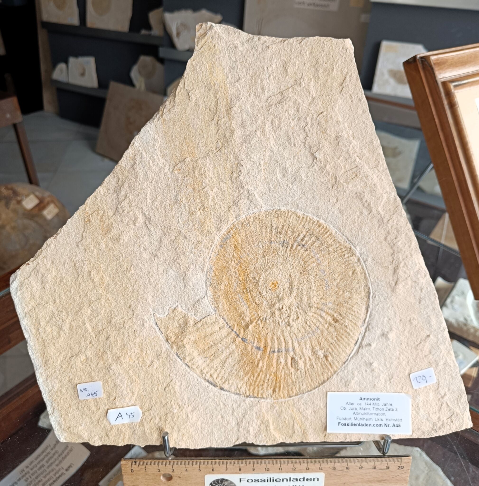 Alter: ca. 144 Mio. Jahre, Ob. Jura, Malm, Tithon Zeta 3, Altmühlformation. Plattenstärke max. ca. 2,2 cm. Durchmesser Ammonit max. ca. 15,5 cm, Gewicht ca. 3815 g. Fundort: Mühlheim, Lkrs. Eichstätt