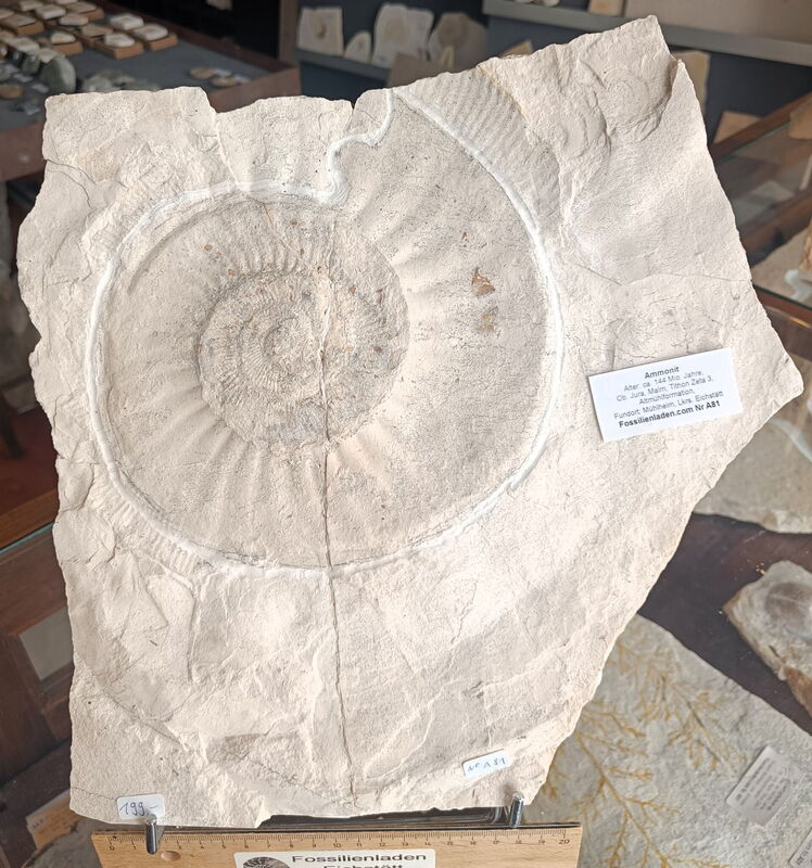 Alter: ca. 144 Mio. Jahre, Ob. Jura, Malm, Tithon Zeta 3, Altmühlformation. Plattenstärke max. ca. 2,8 cm. Durchmesser Ammonit max. ca. 21 cm, Gewicht ca. 3525 g. Zwei Teile geklebt Fundort: Mühlheim, Lkrs. Eichstätt