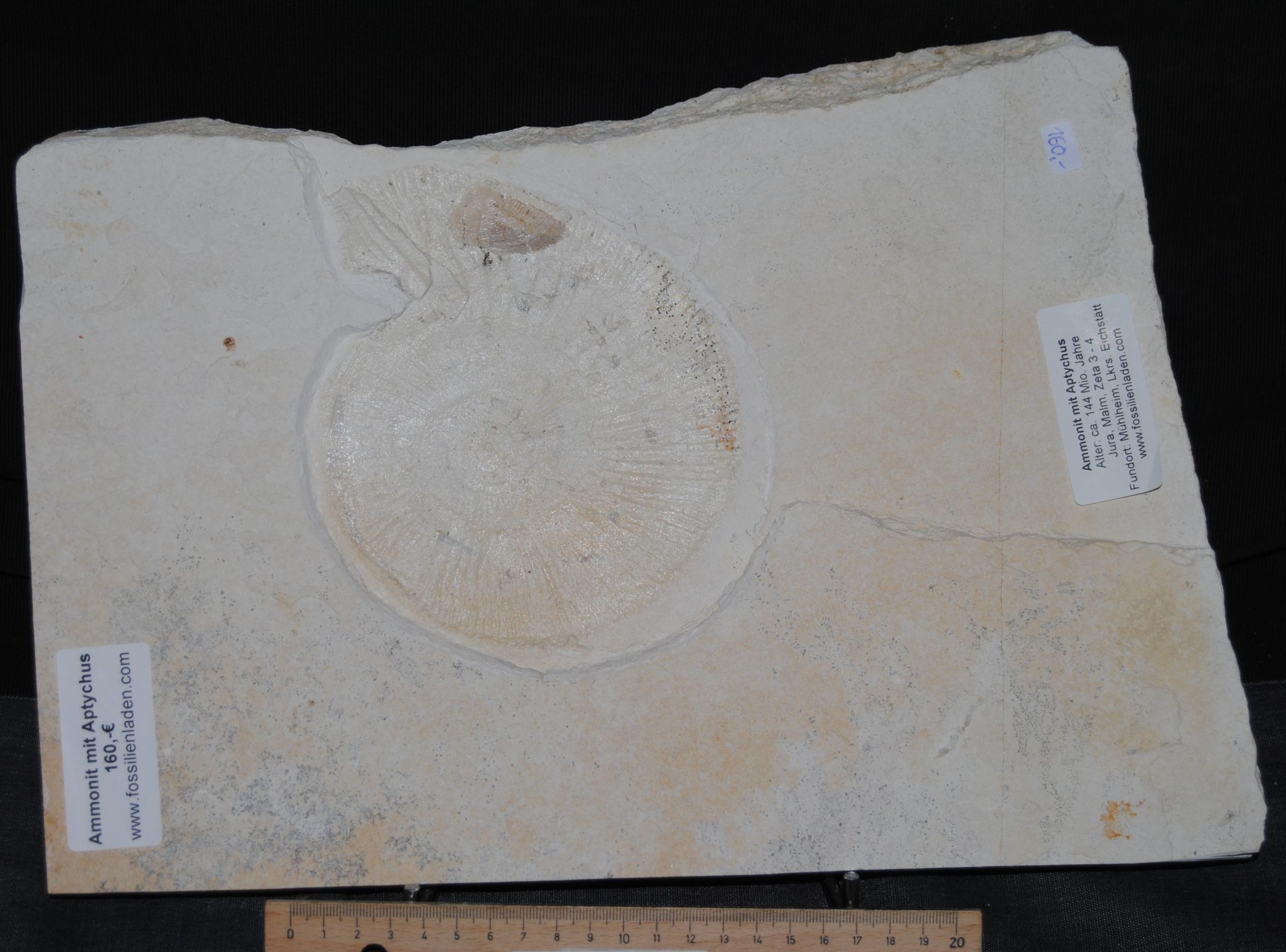 Mit Aptychus. Fundort: Solnhofen, Jura, Malm zeta 2b , Alter ca. 150 Mio. Jahre, Plattenhöhe max ca. 37 cm, Plattenstärke max. ca. 3,9 cm, Gewicht ca. 6 kg.