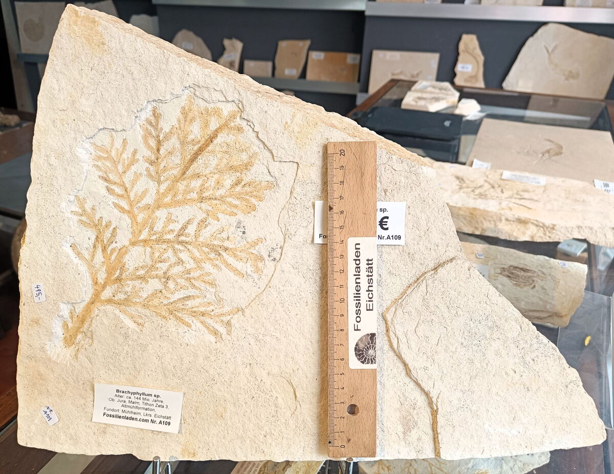 Fundort: Mühlheim, Mörnsheimer Schichten, Stratigrapie: Oberjura, Tithonium, Solnhofen-Formation, Malm zeta 3, Gewicht ca. 7335 g, Stärke ca. 3,7 cm, Fossiles Nadelholz ca. 22 cm. Wunderschön!