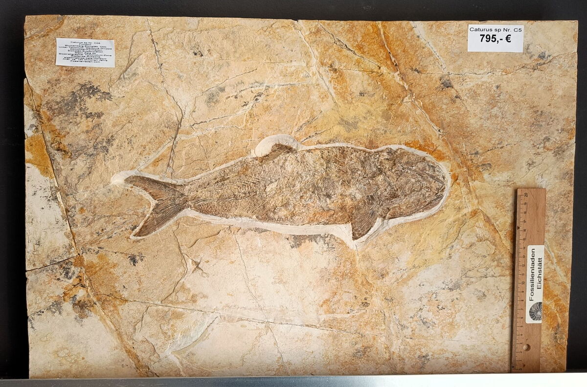 Fundort: Eichstätt Unter-Tithonium, Weißjura-Gruppe, Altmühltal-Formation, Obere Eichstätt-Subformation Malm Zeta 2b Hybonotum-Zone, Riedense-Subzone, eigeltingense-beta-Horizont Plattenstärke ca. 1,3 plus, cm, Platte ca. 61 x 40,5 cm, Fisch max. ca. 36 cm
