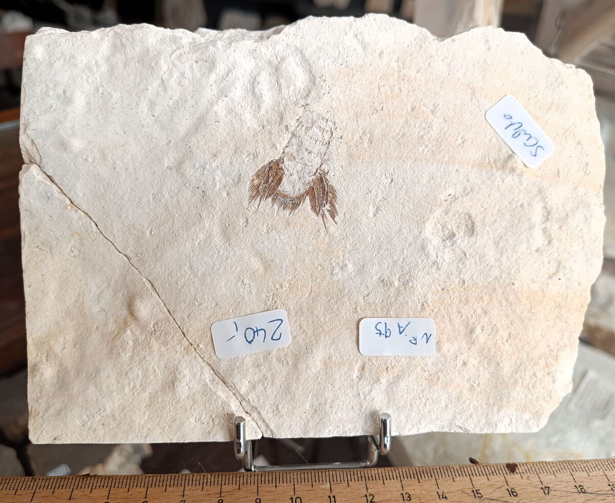 Ordnung: Krebse (Crustacea) und deren Verwandten Familie: Mundfüßer / Heuschreckenkrebse (Stomatopoda) Gattung: Sculda Art: Sculda pennata MUENSTER, 1839 Trivialname: Heuschreckenkrebs Alter: ca. 144 Mio. Jahre, Ob. Jura, Malm, Tithon Zeta 3, Altmühlformation. Plattenstärke max. ca. 1,7 cm. Durchmesser Fossil ca.2,5 cm, Gewicht ca. 430 g. 2 Teile zusammengeklebt Fundort: Mühlheim, Lkrs. Eichstätt