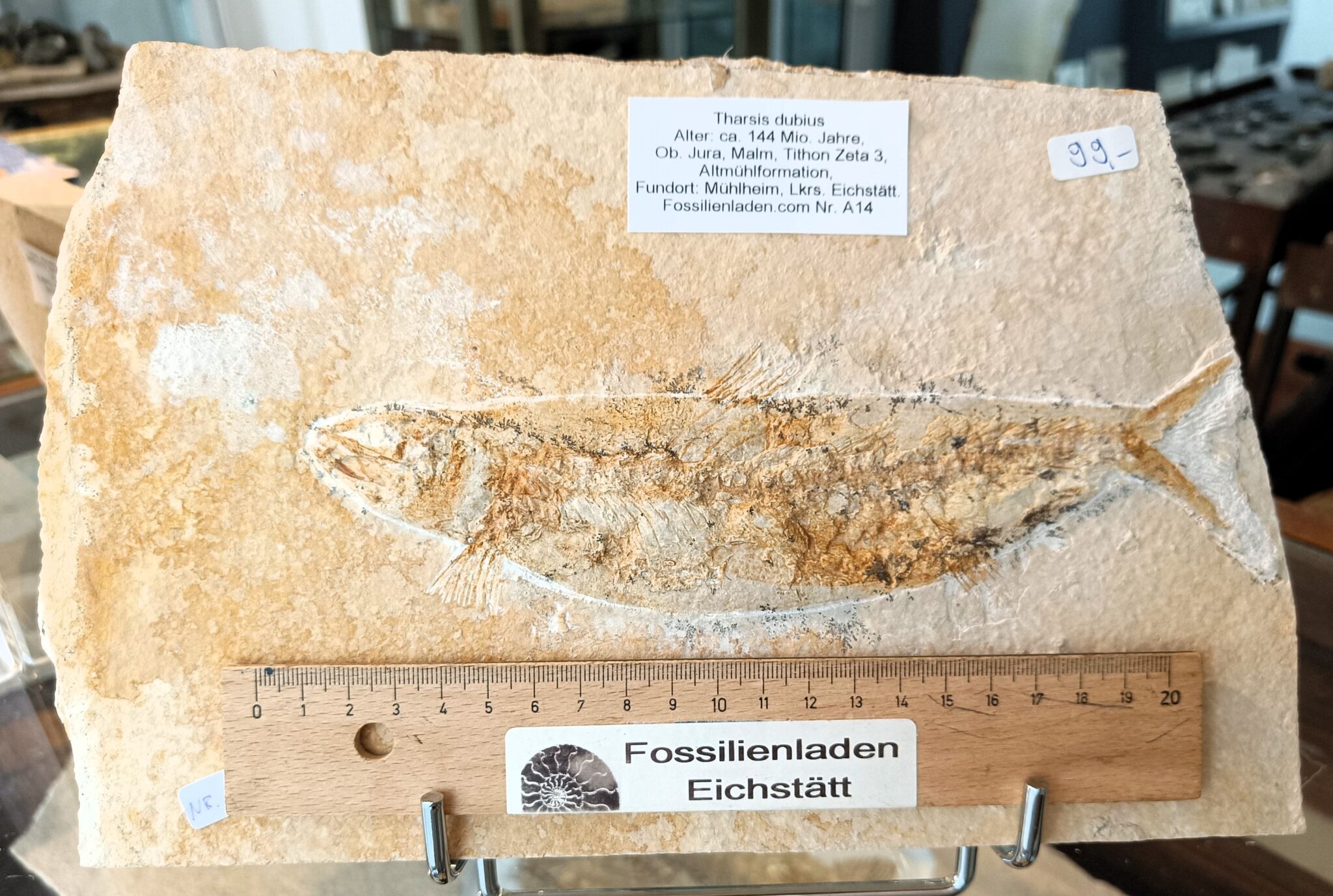 Tharsis dubius, Fundort: Mühlheim, Mörnsheimer Schichten, Stratigrapie: Oberjura, Tithonium, Solnhofen-Formation, Malm zeta 3, Plattenstärke ca. 0,6 cm, Gewicht ca. 0,81 kg. Durchmesser Fossil ca. 21 cm, Kante oben 23 cm, Kante unten 27,5 cm