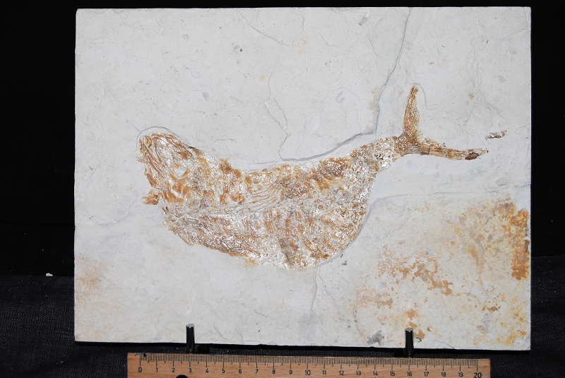 Fundort: Mühlheim, Mörnsheimer Schichten, Stratigrapie: Oberjura, Tithonium, Solnhofen-Formation, Malm zeta 3, Plattenstärke ca. 2,1 cm, Platte ca. 27,5 x 20 cm, Gewicht ca. 1560 g, Fisch ca. 21 cm