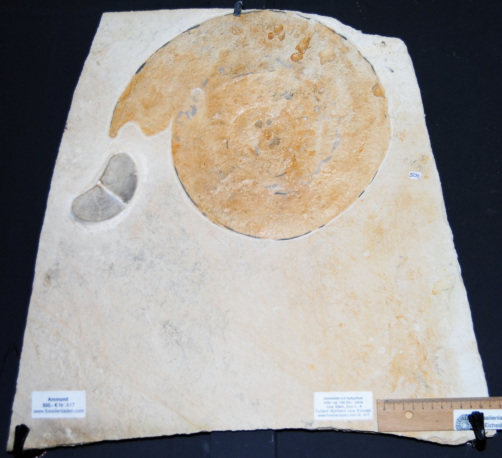 Ammonit max. Durchmesser etwa 33 cm, Aptychus max. 9 cm.