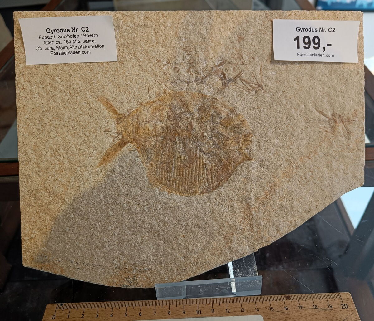 Fundort: Solnhofen, Jura, Malm zeta , Alter ca. 150 Mio. Jahre, Plattenstärke ca. 1,2 cm, Gewicht ca. 1,3 kg. Durchmesser Fossil ca. max. 19 cm. Geschnittene Kante links ca. 17,5 cm, oben ca. 24,5 cm.