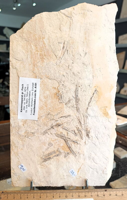 Kiemenknochen eines großen Fisches. Fundort: Mühlheim, Mörnsheim, Landkreis Eichstätt, Stratigrapie: Unteres Thiton, Malm zeta 3, Gewicht 3105 gr., Plattenstärke max. ca. 3,4 cm, lange geschnit. Seite ca. 23 cm.