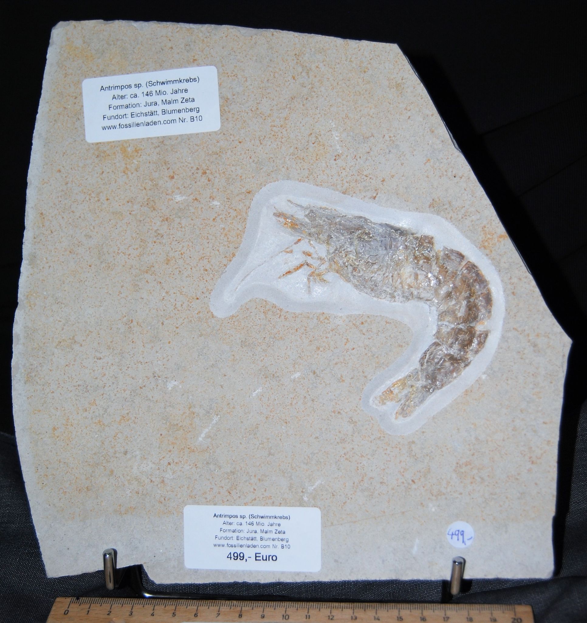 Schöner Antrimpos. Formation: Weißjura, Fundort: Eichstätt. Gewicht ca 2130 g. Plattenstärke ca. 1,6 cm Alter: ca. 147 Mio. Jahre Weißjura, Malm, Zeta Preis inkl. 19% Mwst.