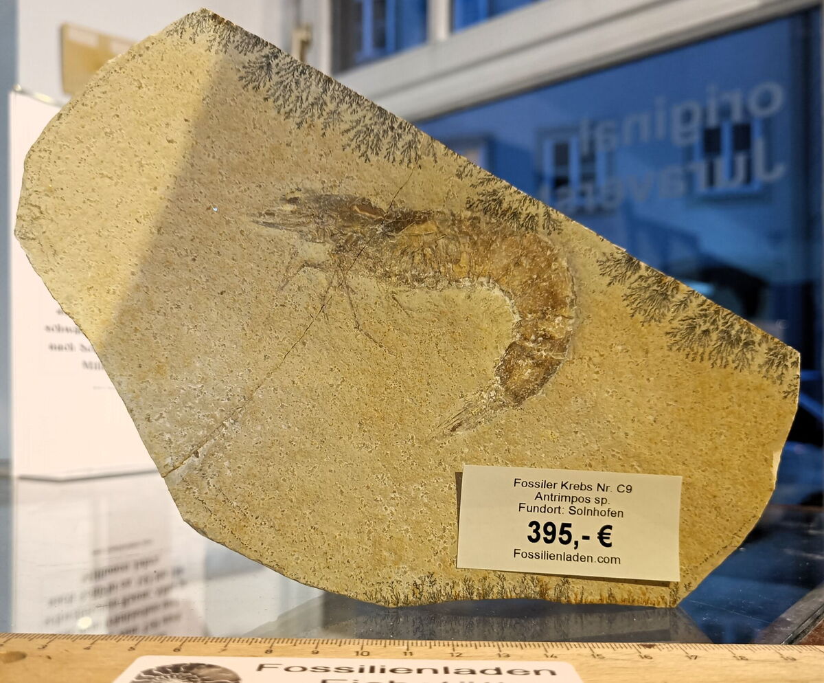 Guter Antrimpos! Fundort: Solnhofen, Jura, Malm zeta , Alter ca. 147 Mio. Jahre. Gewicht ca. 2045 gr. Plattenstärke ca. 3,3 cm, geschnittene Plattenkante ca. 20 cm