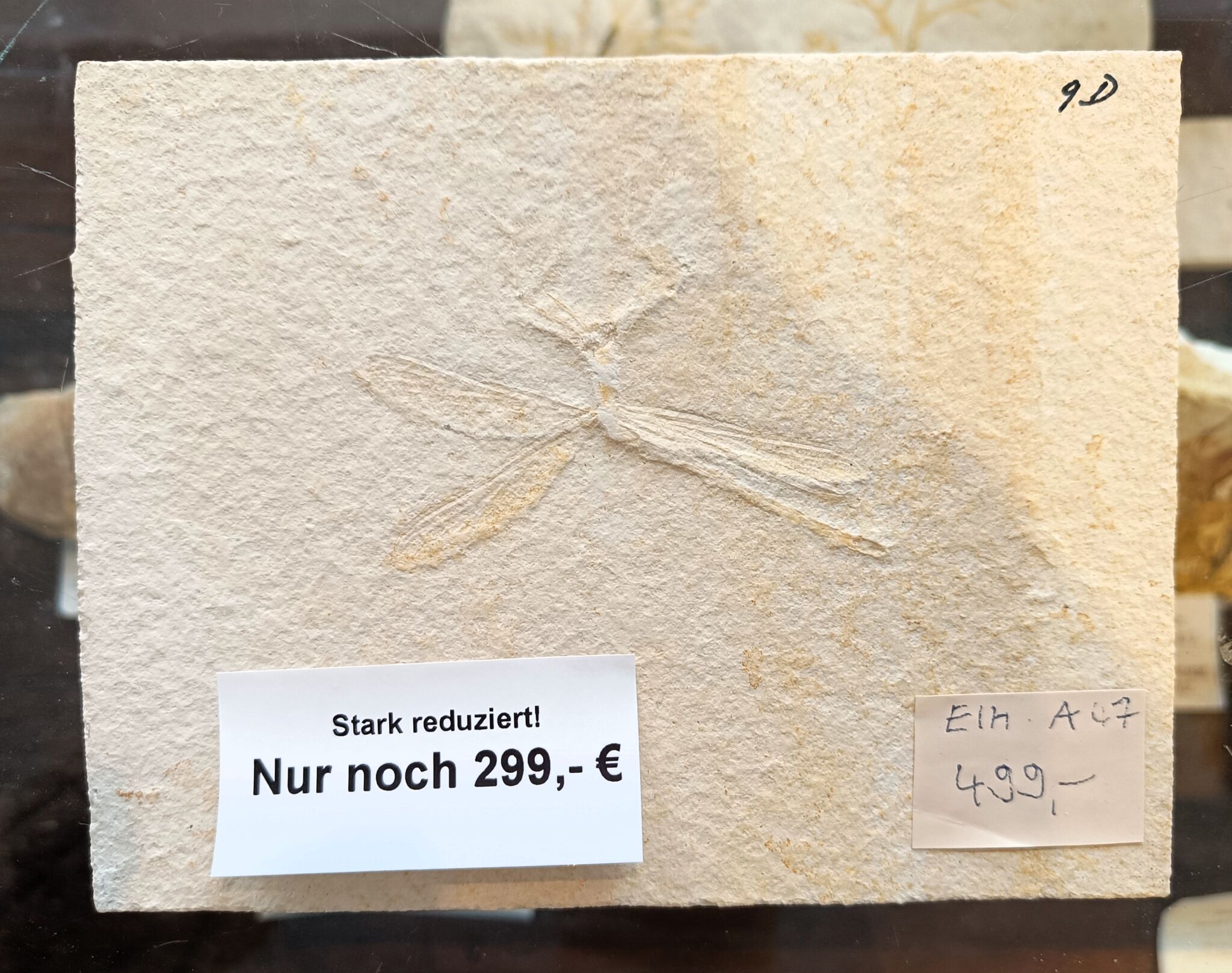 Tarsophlebia eximia (?) Geklebt aus drei Teilen. Fundort: Eichstätt Lithostratigraphie: Tithonium, Weißjura-Gruppe, Altmühltal-Formation, Eichstätt-Subformation, Quentstedt : Malm Zeta 2 a/b, Biostratigraphie: Hybonotum-Zone, Riedense-Subzone, Platte ca. 16 x 12 x 0,5 cm. Gewicht ca. 250 g.