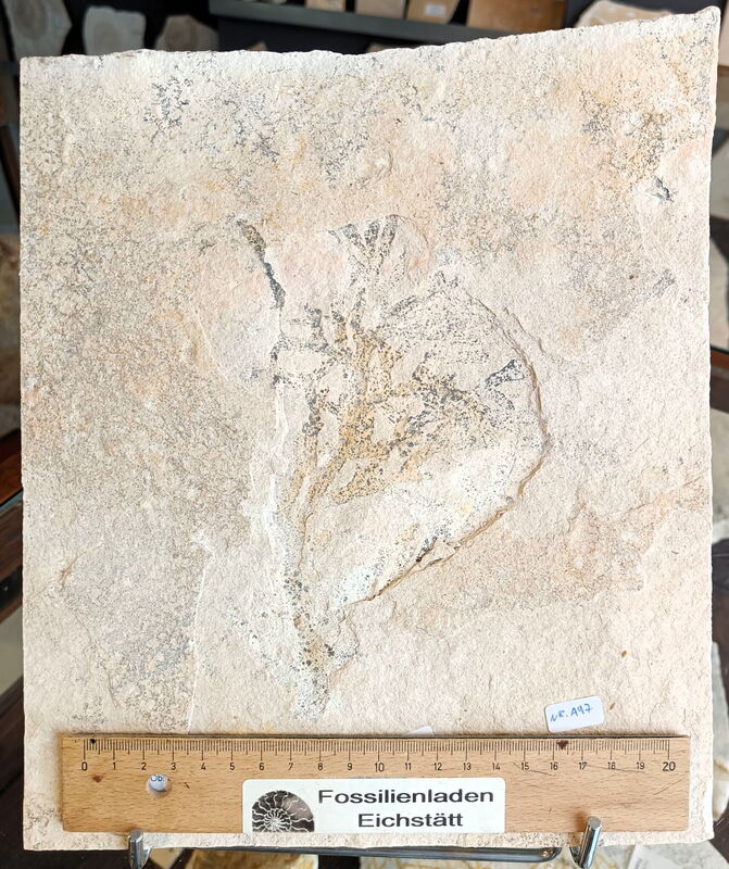 Brachyphyllum, Ordnung: Pflanzen (Plantea), Familie: Nadelholzgewächse (Coniferodopsida), Gattung: Brachyphyllum, Art: Brachyphyllum sp., Fundort: Mühlheim, Mörnsheimer Schichten, Stratigrapie: Oberjura, Tithonium, Solnhofen-Formation, Malm zeta 3, Durchmesser Pflanze max. ca. 17 cm, Gewicht ca. 1405 g, Plattenstärke ca. 1,1 cm, geschnittene Kante rechts ca. 29 cm.