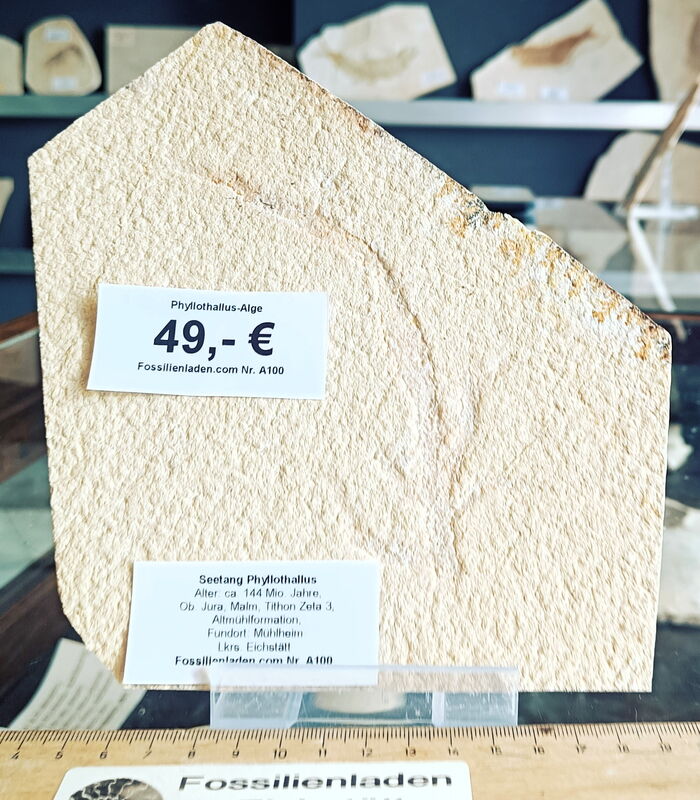 Fundort: Mühlheim, Landkreis Eichstätt, Jura, Malm zeta 3 – 4, Alter ca. 144 Mio. Jahre, Plattenstärke max. 13 mm, Gewicht 865 g. geschnittene Kante unten ca. 13 cm