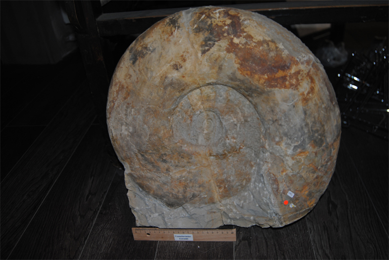 Ammonit, Fundort Drügendorf., Bayern. Gattung: Pachypictonia. Alter ca. 150 Mio Jahre, mittlerer Malm Gamma 2, Durchmesser ca. 46 cm, geklebt und teilweise ergänzt, Rückseite nicht präpariert. Versand nicht möglich, nur Abholung.