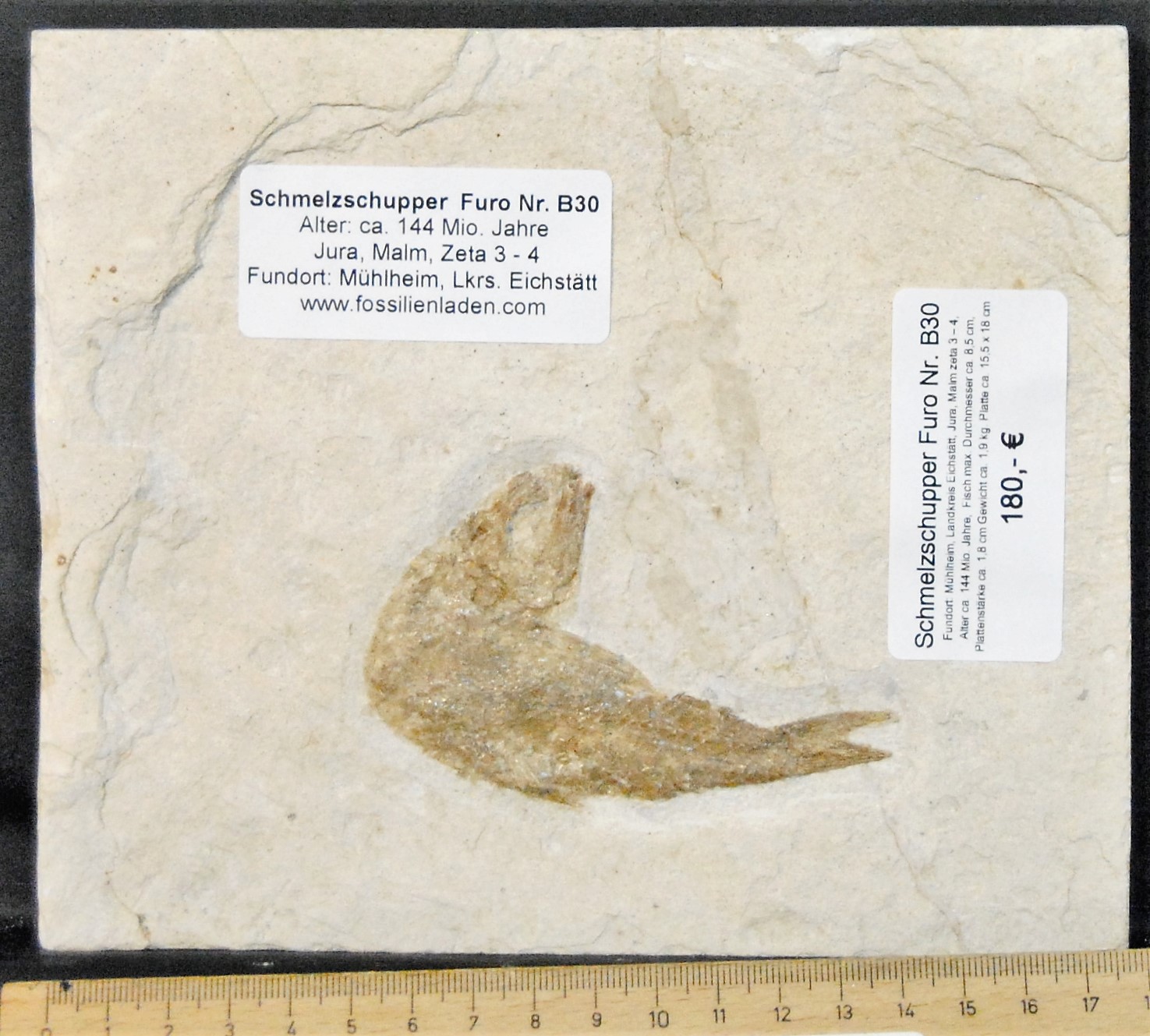 Furo. Fundort: Mühlheim, Landkreis Eichstätt, Jura, Malm zeta 3 – 4, Alter ca. 144 Mio. Jahre, Platte. ca. 15,5 x 18 x 1,8 cm, Gewicht 960 g.