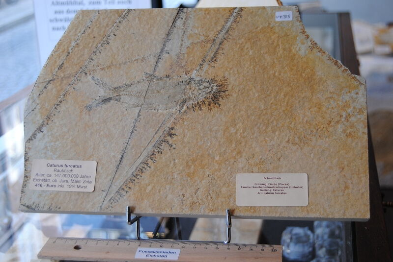 Schnellfisch Caturus furcatus, Alter ca. 147 Mio Jahre, Fundort: Eichstätt, ob. Jura, Malm Zeta, Plattenhöhe ca. 20 cm, Länge Fisch selbst ca. 12 cm