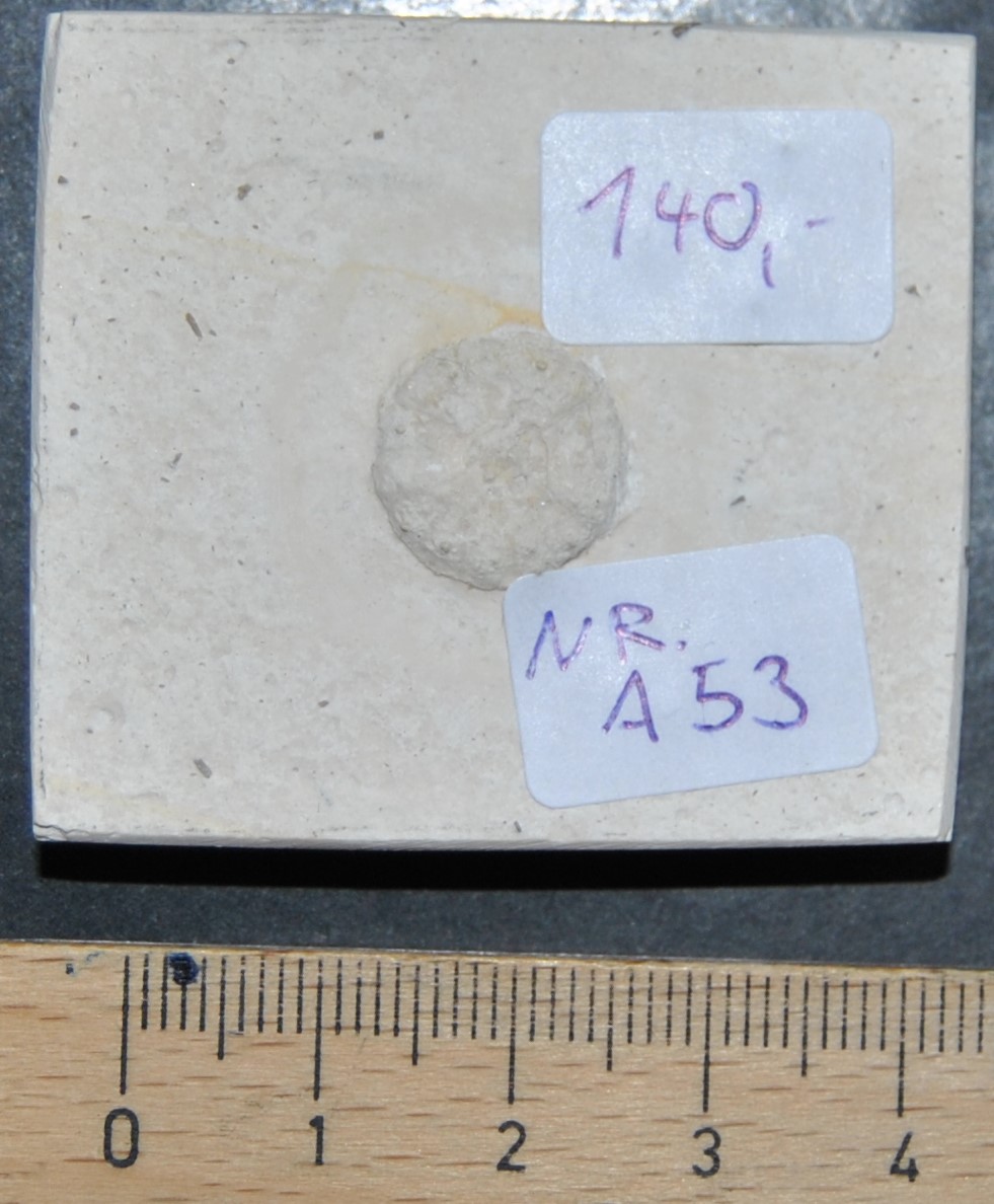 Fundort: Painten, Lkkrs. Kelheim, Niederbayern. Dies ist ein kleiner aber detailreicher, regulärer Seeigel, der Gattung Phymosoma. Alter: Oberer Jura, Kimmeridgium, Malm epsilon (Ca. 150 Mill. Jahre) Plattenstärke ca. 0,8 cm, Platte ca. 4,3 x 4,9 cm, Seeigel Durchmesser ca. 1,1 cm. Gewicht 38 g,