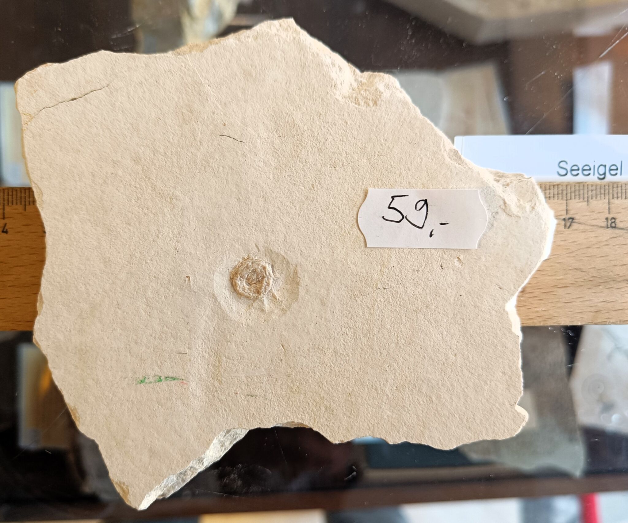 Fundort: Mühlheim, Landkreis Eichstätt, Jura, Malm zeta 3 – 4, Alter ca. 144 Mio. Jahre, Durchmesser Fossil max. ca. 0,8 cm, Gewicht 215 g. Plattenstärke ca. 1,4 cm.