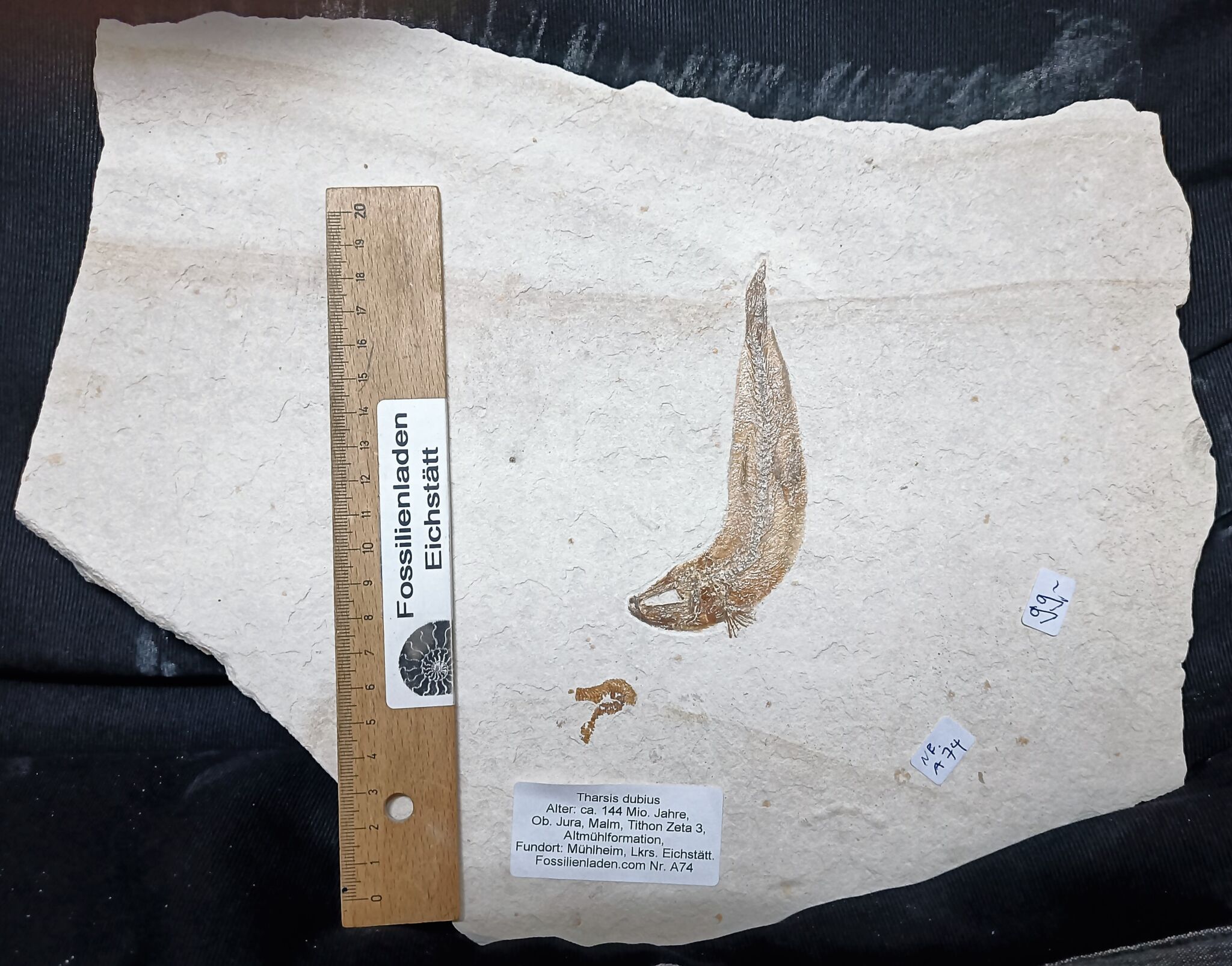Fundort: Mühlheim, Mörnsheimer Schichten, Stratigrapie: Oberjura, Tithonium, Solnhofen-Formation, Malm zeta 3, Gewicht ca 3,4 kg, Plattenstärke ca. 2,2 cm. Fisch Durnesser ca. 11 cm. Versand innerhalb D: 7,90 Euro.