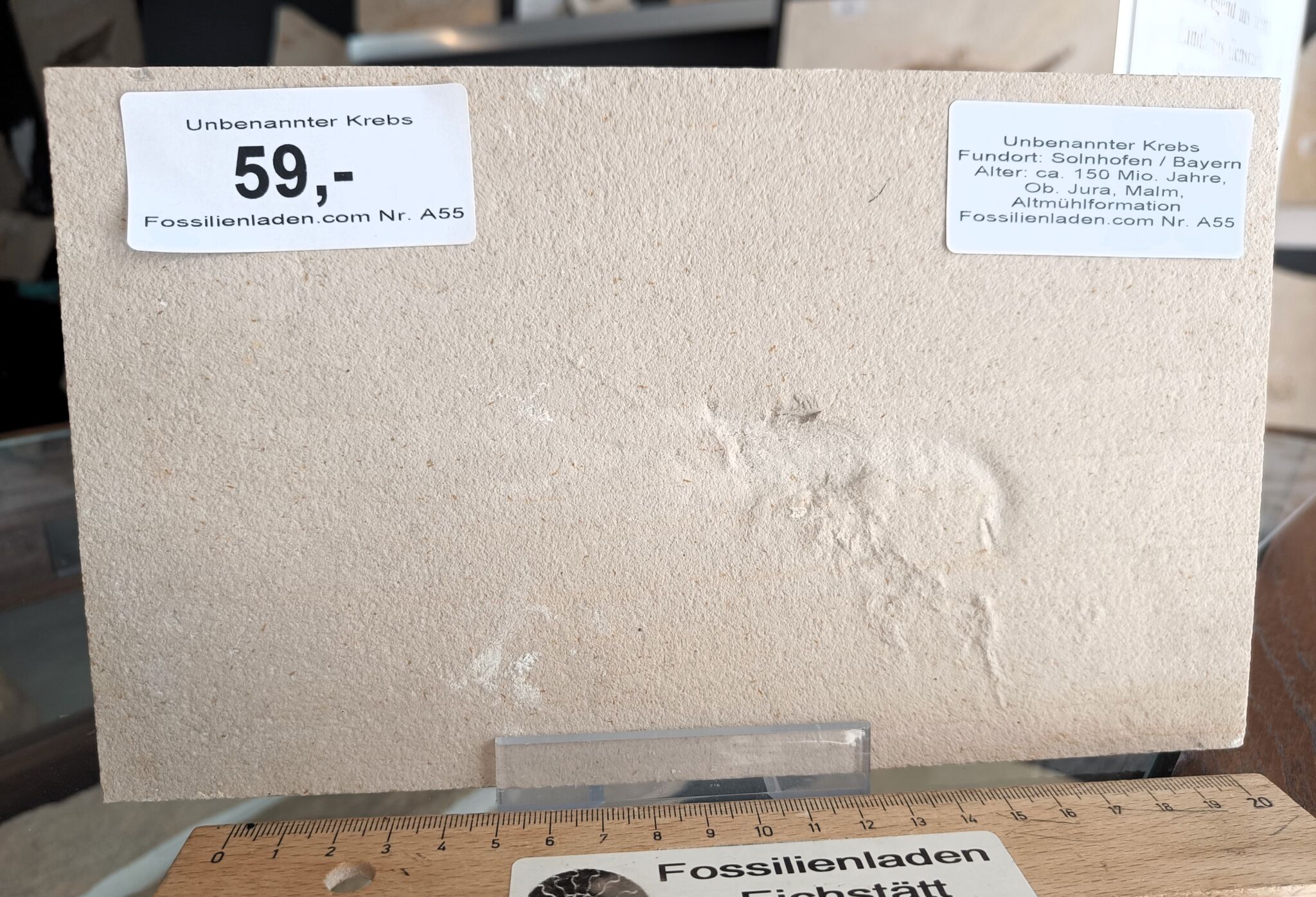 Fundort: Solnhofen, Jura, Malm zeta, Alter: ca. 150 Millionen Jahre, Länge Fossil max. ca. 10 cm, Geschnittene Kanten, ca. 23,4 x 13,7 cm cm, Gewicht ca. 1,275 kg. Plattenstärke ca. 1,5 cm.