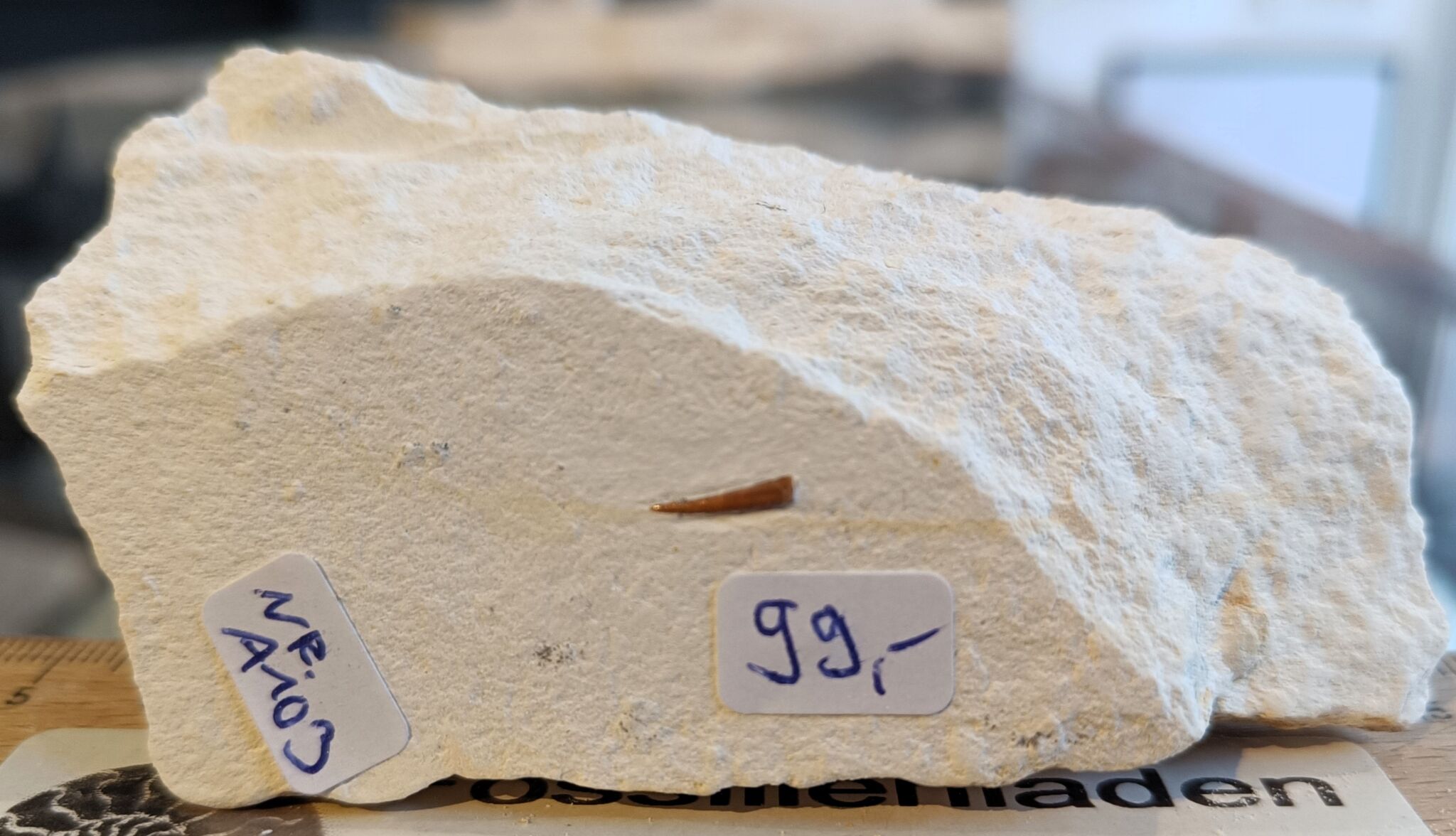 Flugsaurierzahn. Fundort: Mühlheim, Mörnsheim, Landkreis Eichstätt, Stratigrapie: Unteres Thiton, Malm zeta 3, Gewicht 43 gr., Zahn ca. 8 mm, Plattenstärke max. ca. 1,8 cm